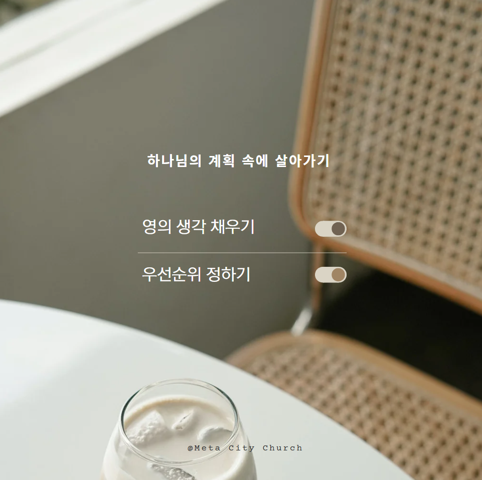 육신의 생각이 아닌 영의 생각으로 살아간다는 것은 하나님께서 주신 목적을 깨닫고 그분의 말씀대로 사는 것입니다. 중요한 것부터 채우는 삶, 하나님을 중심에 두는 삶이 바로 그것입니다.