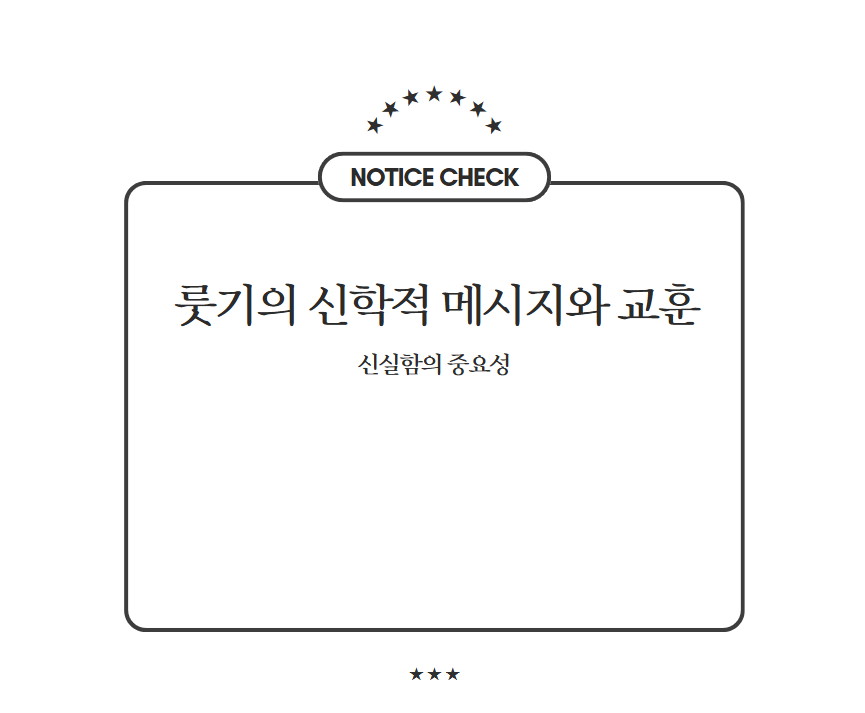 룻기는 단순히 나오미와 룻, 보아스의 이야기가 아니라, 하나님의 섭리와 신실함의 이야기를 담고 있는 책입니다. 평범한 일상 속에서 이루어진 선택과 행동들이 결국 하나님의 원대한 구속사의 중요한 부분이 되었음을 보여줍니다.