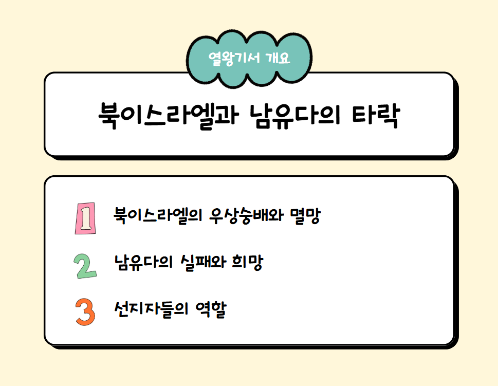 왕국의 분열은 단순한 정치적 사건이 아닙니다. 이는 솔로몬과 이스라엘 백성의 불순종과 우상숭배에 대한 하나님의 심판이었습니다. 열왕기상 11장부터는 분열된 두 왕국의 역사를 병행하며 서술합니다.