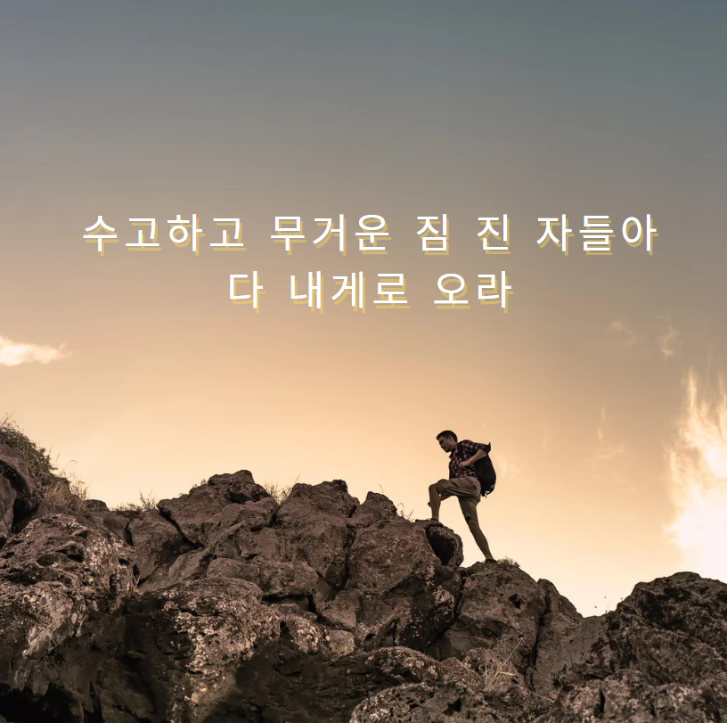 예수님은 오늘도 말씀하십니다. "수고하고 무거운 짐 진 자들아 다 내게로 오라." 우리는 여전히 많은 짐을 지고 애쓰며 살아가고 있지 않나요? 예수님께 우리의 무거운 짐을 내려놓아야 합니다.